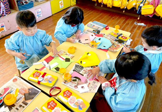 小さな経験の積み重ねが指先をスムーズに動かせる器用さ、思い浮かんだ事をカタチにする創造力。お絵描き・折り紙といった製作、絵本の読み聞かせも当園が大切にしている時間です。例えば壁面装飾は季節ごとに、子どもたちの色塗りや折り紙による製作で仕上げています。できあがった壁面を見ながら歌ったり、絵本を読んだりと保育の幅も広がります。指先を動かし、歌を歌い、絵本に耳をかたむける。毎日の保育のなかでの静と動、小さな経験の積み重ねが、子どもたちの大きな力を育みます。
